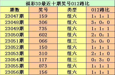 开奖精致:第2023056期3D奖号为156。格式:组六,奇偶比2:1,大小比2:1,012路比为1:1:1。
