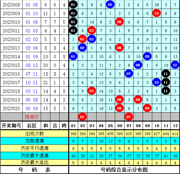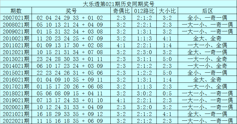 后区第一位分析:在历史第021期同时奖号中,后区第一位号码一齐在01-09区段出现,其中该位号码奇偶比为10:6,大小比为4:12,012路比为6:8:2,本期第一位号码参考02。